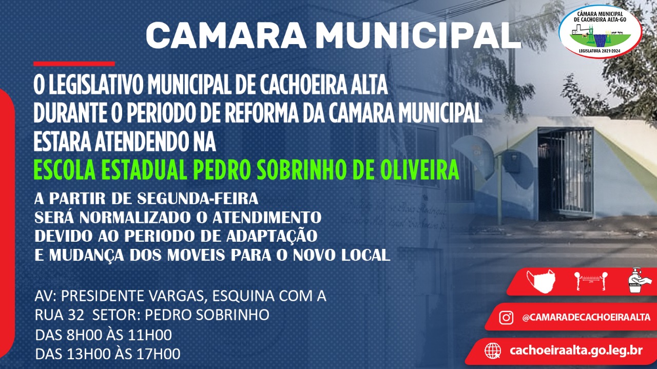 AS SESSÕES, A PARTIR DESTA DATA, OCORRERÃO FORA DAS DEPENDÊNCIAS DESTA AUGUSTA CASA, EM RAZÃO DA REFORMA E ADEQUAÇÃO DAS REFERIDAS INSTALAÇÕES. INFORMA AINDA QUE TODOS OS TRABALHOS ADMINISTRATIVOS DESTA AUGUSTA CASA, ESTARÃO FUNCIONANDO NA ANTIGA SEDE DA ESCOLA ESTADUAL PEDRO SOBRINHO DE OLIVEIRA, LOCALIZADA NA AVENIDA PRESIDENTE VARGAS, Nº 724 – SETOR PEDRO SOBRINHO – CACHOEIRA ALTA – ESTADO GOIÁS.